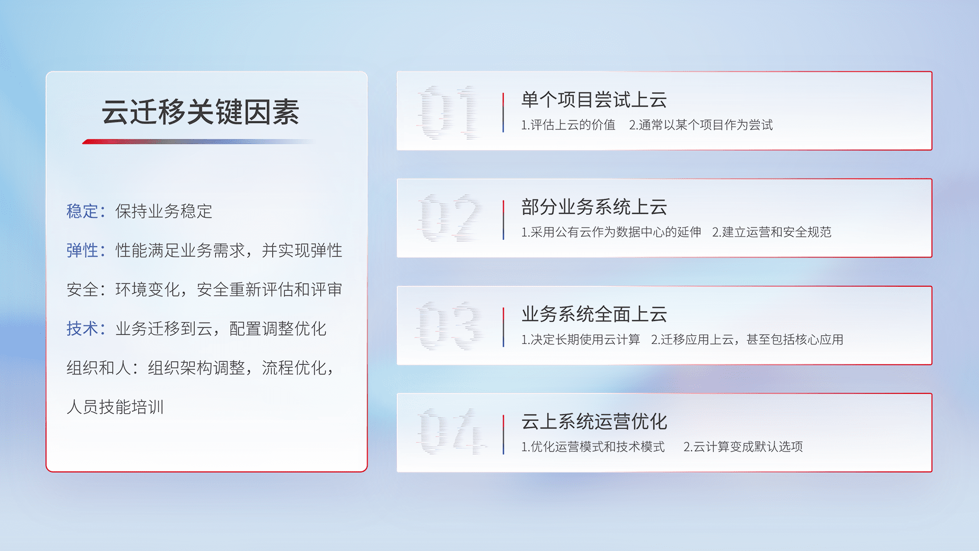 结合实际业务,,,从规划设计、、、、云平台选型、、、云原生改造、、、、数据迁移、、、、集成交付,,迁移全过程为客户识别最佳上云路径,,做好风险识别管理,,设计网络架构、、身份权限、、、安全审计合规、、、、操作审计、、、日志审计、、监控告警策略、、、多站点容灾设计等,,对云上基础设施进行整体规划,,提升IT治理水平,,,,以满足弹性、、、高可用、、、、高性能的需求。。。