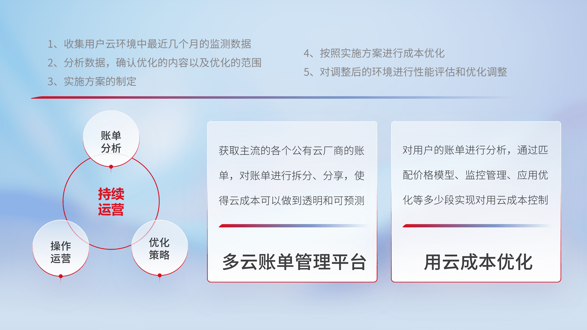 通过多云纳管,,,以统一的资源数据模型把客户的云资源进行抽象和封装,,,,进而实现对多云资源的统一操作,,保障云资源管理的可靠性、、、稳定性与可用性。。量身定制化运维内容,,,配置、、、、开发运维、、、补丁管理、、备份、、监控、、认证和访问管理、、审计和日常巡检等,,,保障在用云过程中的可靠度,,稳定度以及高可用率。。。。